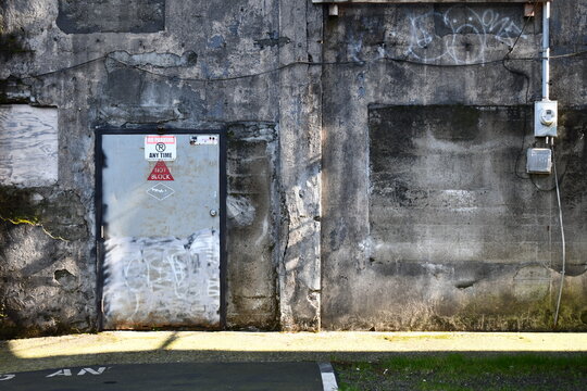 Back alleyway exit, do not block exit sign, dingy wall.