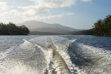 tinny dinghy boat on the water making a wake behind a boat making waves on a river in a national park in australia. beach in summer, dingy going fast