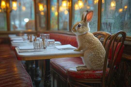 Whimsical rabbit dining alone in cozy restaurant setting