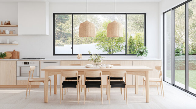 A modern dining room featuring wooden table with black chairs, large windows allowing natural light, and stylish pendant lights. serene atmosphere is enhanced by greenery outside