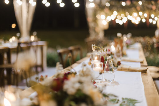 Wedding reception night dinner setup table with beautiful flower decoration.