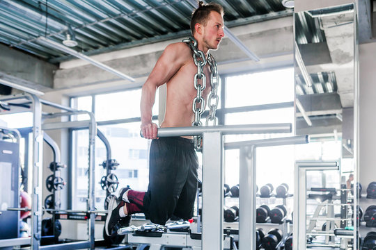 Sportsman with a huge metal chain around his neck. Push-ups on the uneven bars in the gym
