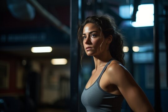 Athlete woman doing triceps dip exercise on parallel bars with heavy weight plate in a gym
