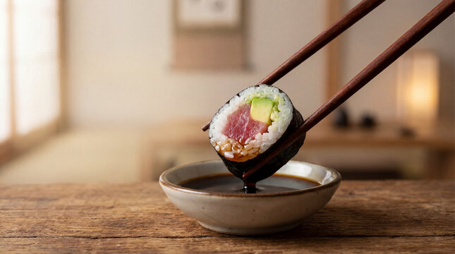 Tuna Avocado Sushi Roll Dipped in Soy Sauce with Chopsticks