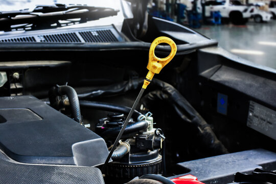 Close up of yellow oil dipstick for measuring oil level inside the engine compartment. Car maintenance concept.