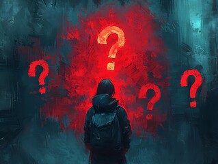 Mystery concept with floating question marks on dark background