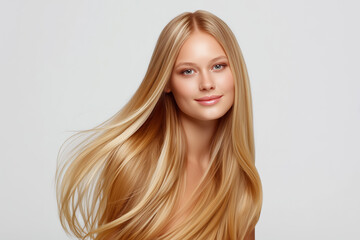 A young blonde woman with natural hair color looks directly at the camera against a light gray background, studio photograph.