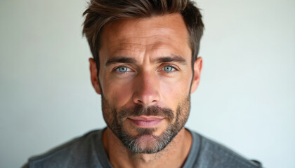 Close up of mature man face with blue eyes and beard. Male has short brown hair and stubble. Man looks directly at camera with calm serious expression and slight smile.