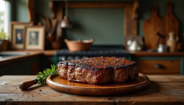 Steak served on rustic wooden plate cozy cabin surrounded by pine trees, captured from directly above with shallow depth of field