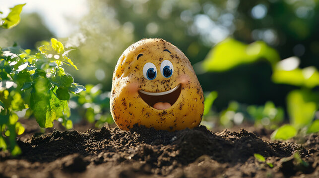 A cheerful anthropomorphic potato character enjoying a sunny patch of soil, evoking joy and the spirit of organic farming.