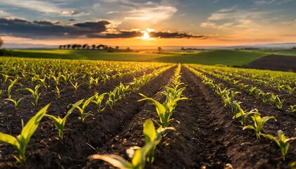 Rows of young corn plants on a fertile field with dark soil Green corn field in the sunset Green corn maize field in early stage