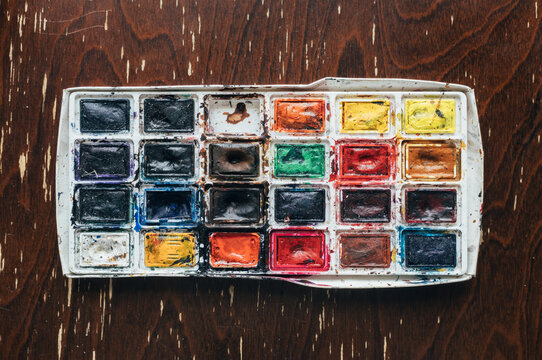 battered worn out watercolor palette, heavily used.