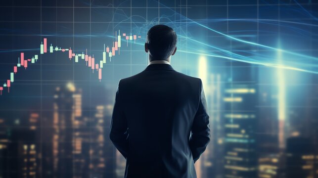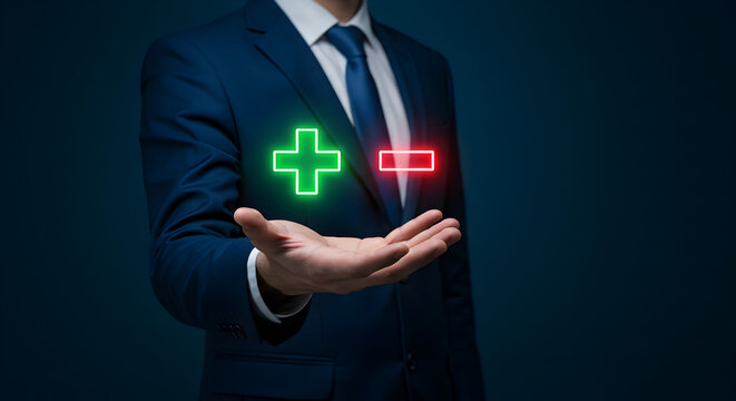 Man in Blue Suit Holding Glowing Plus and Minus Signs on Dark Background