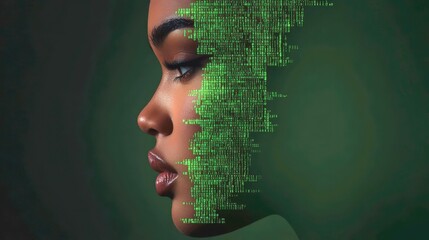 A person’s face partially erased by falling green digital code (à la The Matrix)
