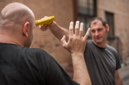 Kapap instructor demonstrates self defense techniques against a gun point. Gun Disarm.