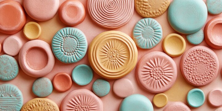 Colorful clay disks forming an abstract pattern, embossed and concave designs adding depth and texture