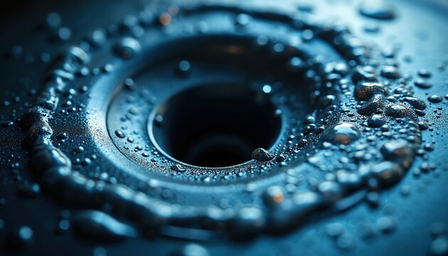 Close up of water swirling down sink drain. Liquid forms a vortex pattern as it flows down the plumbing fixture. Wet surface with many tiny water drops.