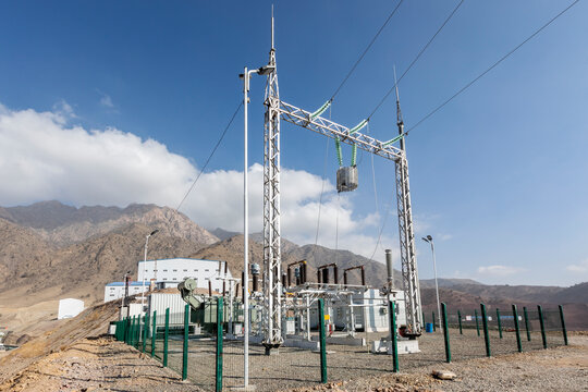 View of the electrical substation (electrical switchyard). It may include transformers to change voltage levels between high transmission voltages and lower distribution voltages.