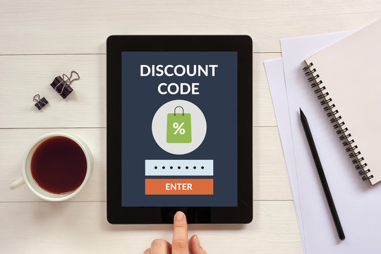 Discount code concept on tablet screen with office objects. All screen content is designed by me