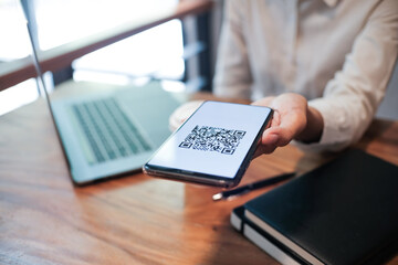 Hand touching smart phone login application system to scan qr code for business financial transaction and new modern technology