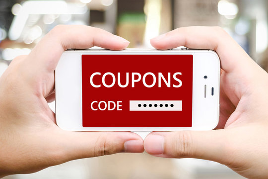 Hand holding smart phone with discount couopns code on screen