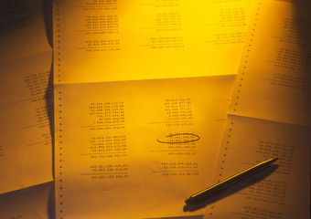 A business professional identifying gaps in a pipeline report, using a magnifying glass on printed documents