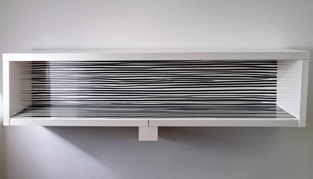 white wall mounted shelf with black and white striped surface sleek wall mounted storage unit featuring white base and distinct black and white striped surface