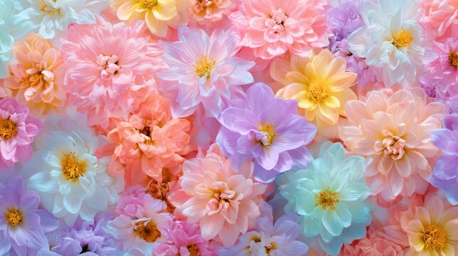 Mothers Day, Valentines Day, love holiday theme. A vibrant array of pink, blue, and yellow dahlias, each with a distinct yellow center, set against a white background.