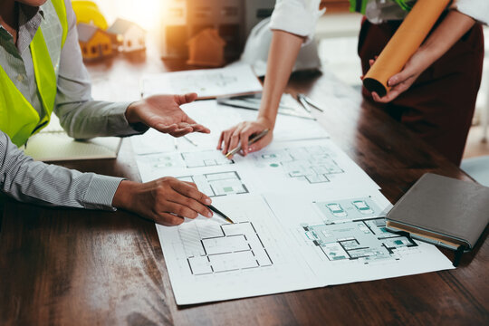 Engineering team meeting for colleagues discussing and reviewing blueprints at desk in office Engineers and workers planning for construction and renovation building projects in workplace