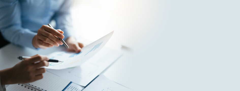 Business teamwork brainstorming meeting process. Business people discussing the charts and graphs showing the results of their successful teamwork.