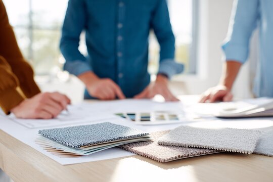 Interior designers working together in a cozy workshop, choosing colors and materials to beautify furniture, crafting modern decor with passion and creativity