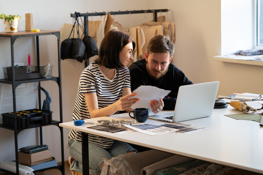 Two young dressmaker or designer colleagues working and discussing fashion project designers and look through fabric samples for clothes, profession and job occupation