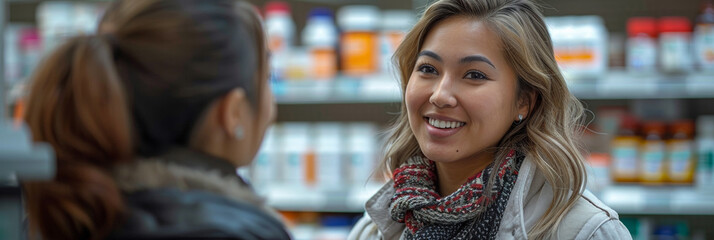 Friends chat while shopping at a pharmacy, discussing supplements and medicine with a smiling pharmacist.