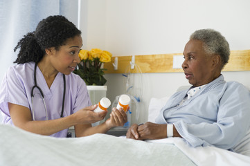 Nurse explaining medication to patient in hospital bed