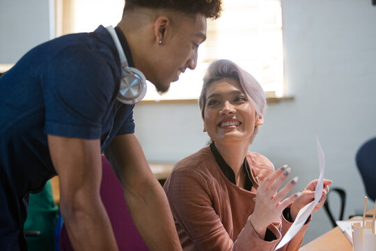 Two colleagues discussing paperwork in office