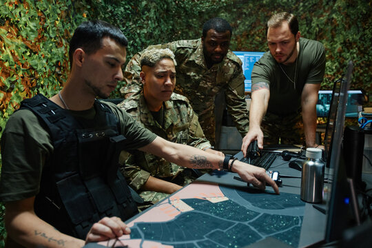 Group of young intercultural officers in uniform looking at map and pointing at it while discussing tactics and strategies of army