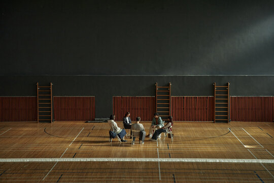 Group of multiethnic teenagers sitting in circle on chairs discussing psychology topics in gymnasium, engaging in collaborative learning activity as part of student group session