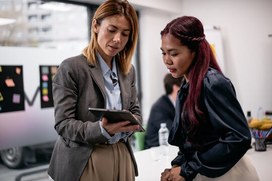 Businesswoman engaging in tablet discussion with colleague in modern office