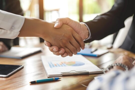 Middle-aged couple shaking hands with their financial planner after successfully discussing and finalizing their retirement plans.