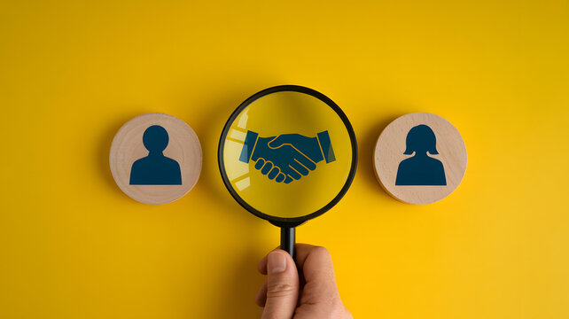 Hand holding magnifying glass over handshake icon between two person icons, symbolizing agreement.