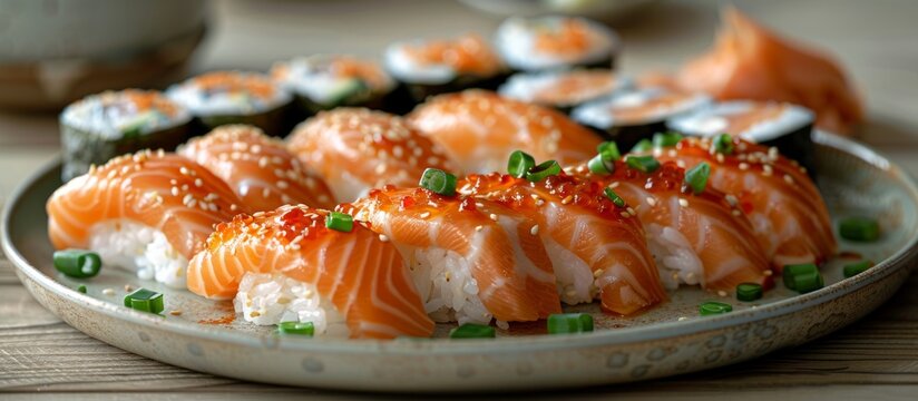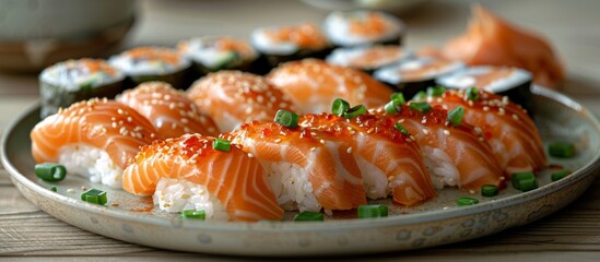 Close-Up of Fresh Sushi Platter with Salmon Nigiri and Maki Rolls