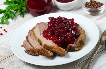 Rich and flavorful wildschweinbraten, a roasted wild boar game dish, presented on a plate, often served with cranberry sauce for a special, memorable meal.