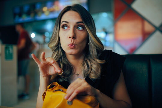 Woman Ready to Cheat Hiding her Wedding Ring in a Purse. Unfaithful wife ready to flirt with another man in a restaurant