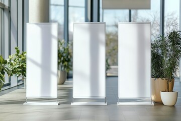 Modern Office Interior Featuring Three Blank Display Boards With Natural Light and Indoor Plants