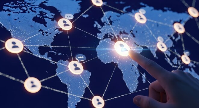Global network connection concept showing digital human figures linked by data lines across a futuristic glowing planet Earth.