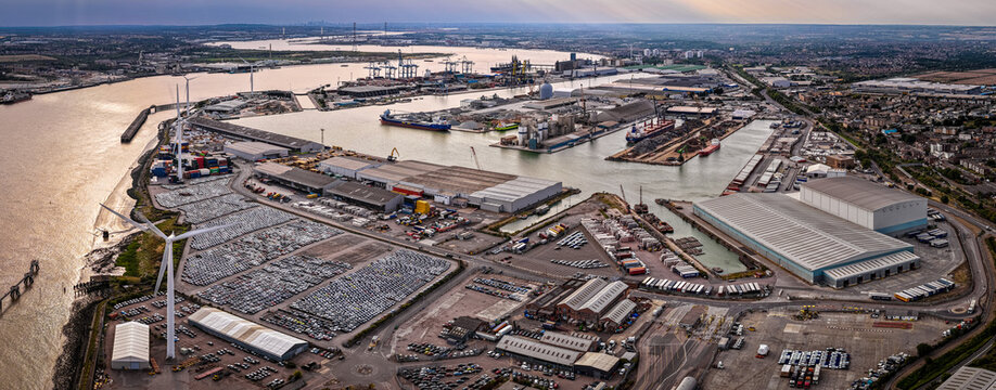 Wide-angle aerial image of the Port of London, showing industrial shipping activity, warehouses, and container docks. Ideal for logistics, maritime trade, transport, economy, and infrastructure themes