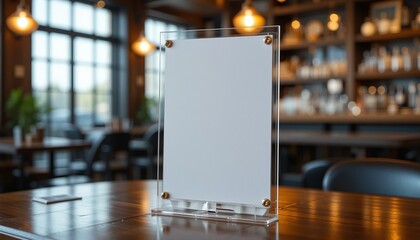 A blank white sign held within a clear acrylic frame stands on a polished wooden table, beckoning