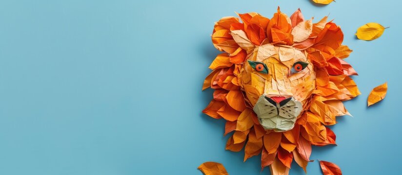 A paper lion head, intricately crafted by children, is displayed against a soft blue backdrop. The detailed artistry of the lions mane and features stands out against the simple background.