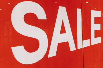 Sale at a clothing store. Red posters with the word Sale at the entrance to the mall