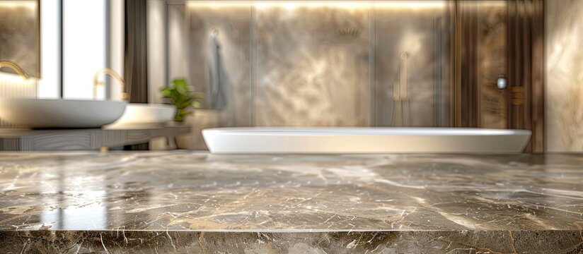 Empty marble top table with a blurred bathroom interior background for product display montage. Copy space image. Place for adding text and design